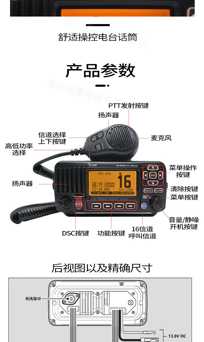 海事甚高頻電臺,內(nèi)置通用海事頻點。DSC功能,在遇險是及時發(fā)出緊急求救信號。一鍵16信道緊急呼叫。CMIIT 核準證代碼CMIIT ID: 2016FJ1269