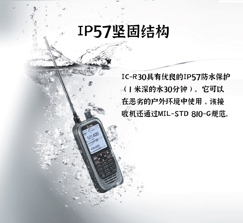 IP57堅(jiān)固結(jié)構(gòu)  IC-R30具有優(yōu)良的IP57防水保護(hù)(1米深的水30分鐘)。它可以在惡劣的戶外環(huán)境中使用。該接收機(jī)還通過(guò)MIL-STD 810-G規(guī)范