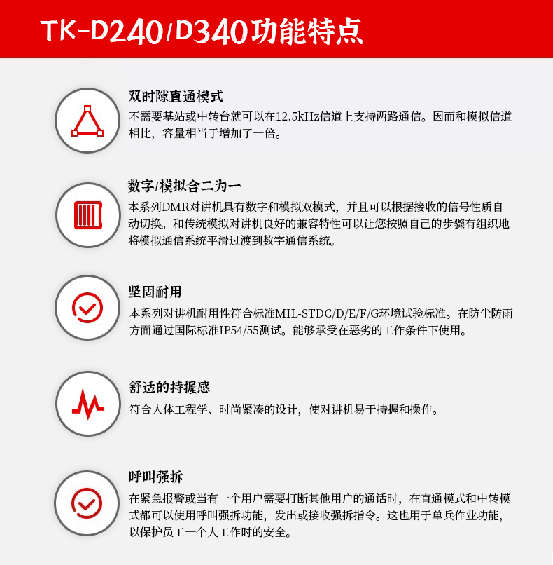 雙時隙TDMA,同時發射語音和數據。 數字/模擬合二為一,兼容性高 使用5-5-90待機可達10小時以上。 堅固耐用 呼叫強拆下線功能 雙時隙直通模式 舒適的持握感 清晰、強勁的語音