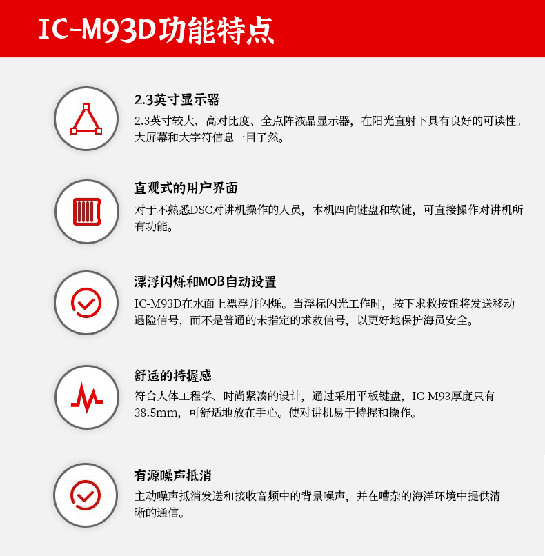 2.3英寸顯示器,操作一目了然 漂浮設計,掉到水里也可以輕松撈起 直觀式的用戶界面,操作更簡單。 內置DSC,帶CH70接收 內置人員掉水功能。 內置綜合全球衛星導航系統GNSS接收