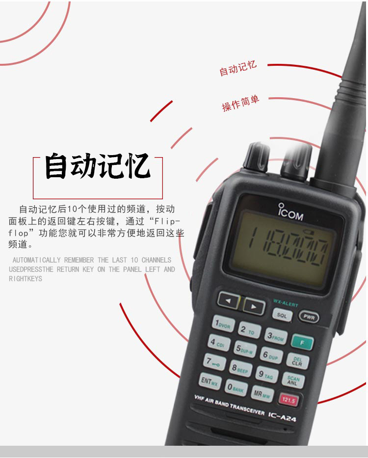 航空頻段適應機場,飛機調度通訊 寬大的鍵盤方便信道編程 具有背光顯示器和背光夜明鍵盤 專用頻率121.5Mhz應急按鍵發送緊急信號。