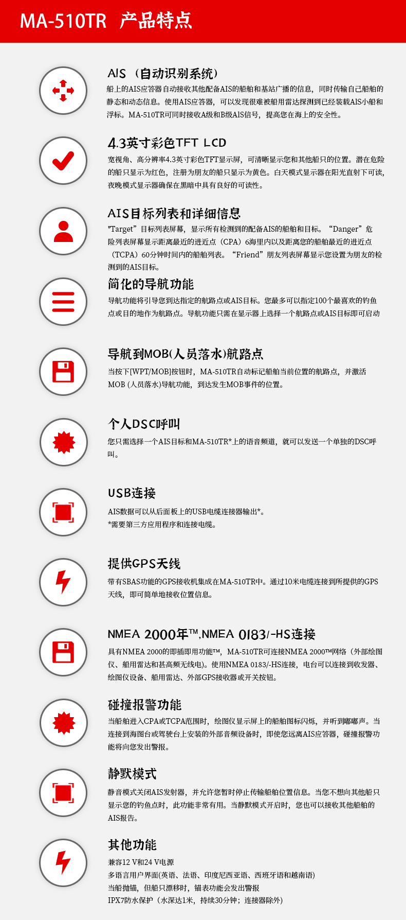 • 內(nèi)置AIS自動識別系統(tǒng),發(fā)射信號,提高航海安全性