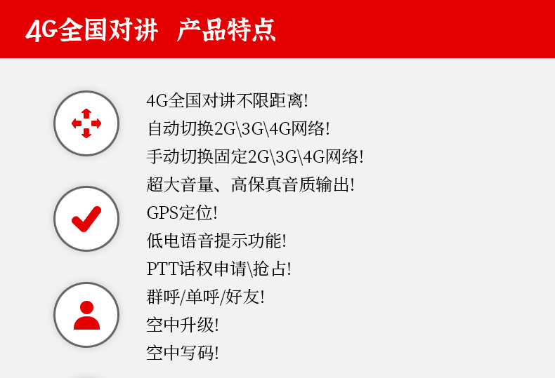 4G全國對講不限距離! 自動切換2G\3G\4G網絡! 手動切換固定2G\3G\4G網絡! 超大音量、高保真音質輸出! GPS定位!