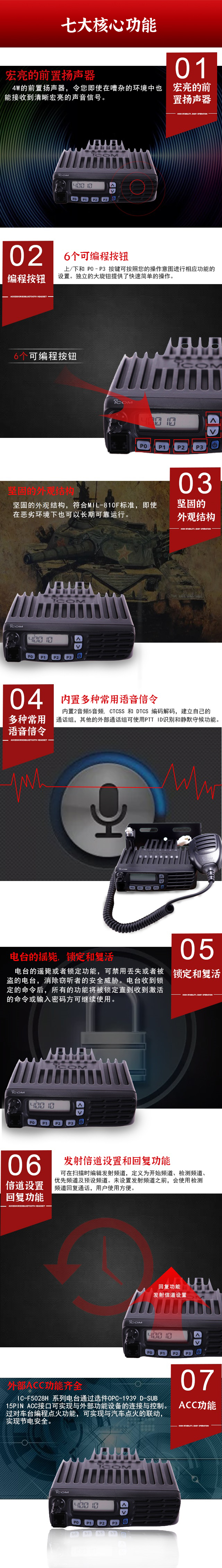 7 外部ACC功能齊全 IC-F5028H系列電臺通過選件OPC-1939 D-SUB15PIN ACC 接口可實現與外部功能設備的連接和控制。或對車臺編程點火功能,可實現與汽車點火的聯動,實現節電安全。